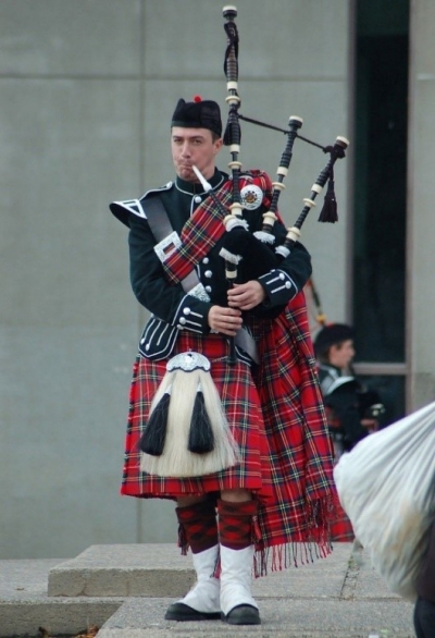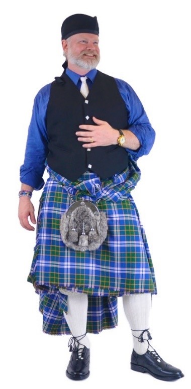 What defines the clan other than the name?  It would be the appearance.  Each Scottish clan designed and had a crest (a badge), a tartan which was a woven wool cloth with a pattern unique to the clan. This tartan was displayed as a pattern on a Kilt.  In addition, there were additions to the kilt such as the sporran, a type of purse worn on a belt (Kilts don’t have pockets).  Special hats, socks and shoes and ceremonial knifes may be included.  Here are examples of kilts: